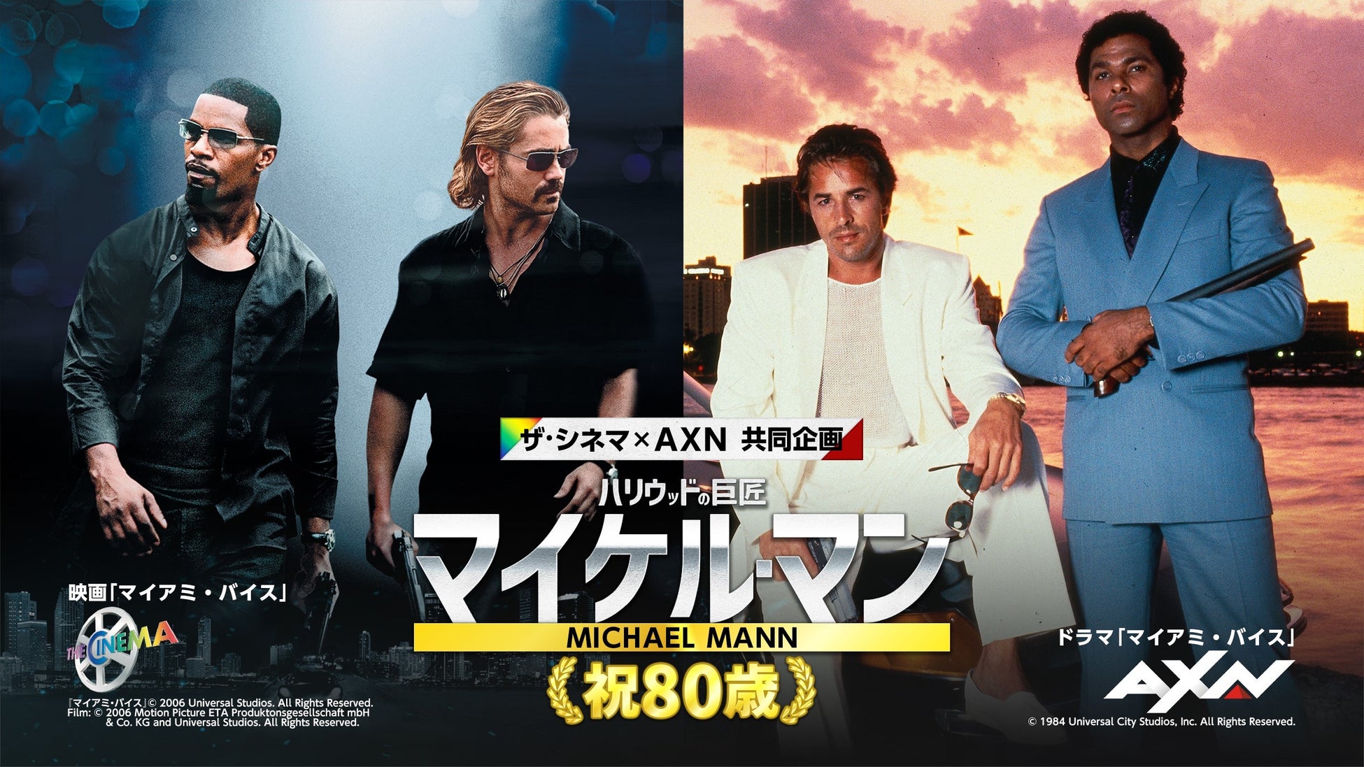 AXNでは大ヒットドラマ『マイアミ・バイス』二カ国語版1~3シーズンを2/1(水)より放送スタートいたします。ザ・シネマでは映画版『マイアミ・バイス』をはじめ、熱狂的なファンを持つ初期作『ザ・キープ』から、超人気作『ヒート』まで、漢気あふれる映画5作を2月5日(日)マイケル・マン監督の誕生日当日に一挙放送いたします。