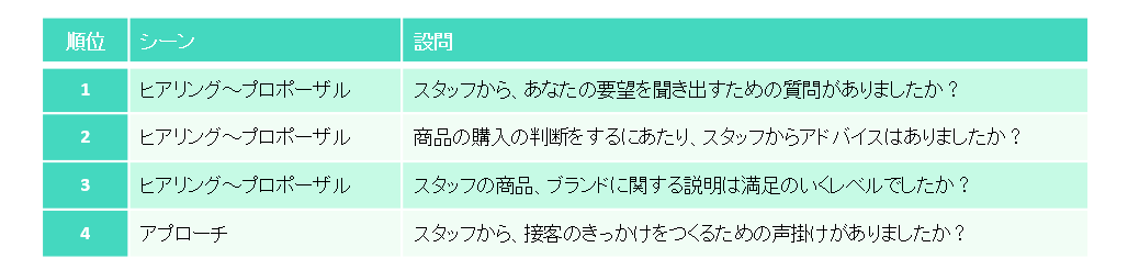 『SEEP』の調査設計は、接客プロセスのシーンと接客体験全体を分析しています。接客プロセスは、お客様との出会いの部分である「アプローチ」、そこからお客様に寄り添う形で要望を聞きながら自社商品の提案を行う「ヒアリング~プロポーザル」、そして最終プロセスである「クロージング」の3つのシーンとなります。そこに「基本項目」「印象項目」を追加し、5つのシーンから調査した結果をポイント制で示しています。