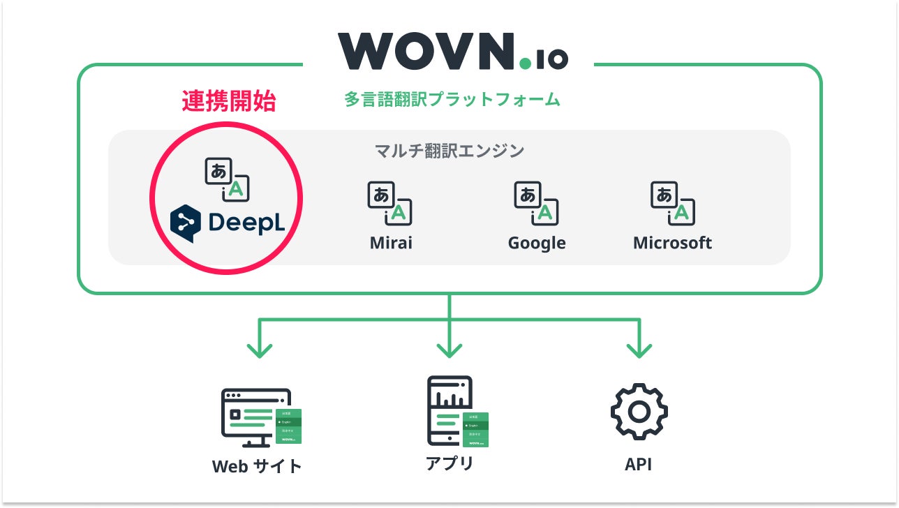 WOVN は、これまでも『Google 翻訳』、『みらい翻訳』、Microsoft Azure Cognitive Services の『Translator』といった様々な AI 翻訳エンジンと連携し、Web サイト、アプリなどの特性に応じた最適な多言語翻訳を提供してまいりました。今回、新たに翻訳精度の高さと翻訳文の自然さ・流暢さに強みを持つ『DeepL』との接続が可能となります。