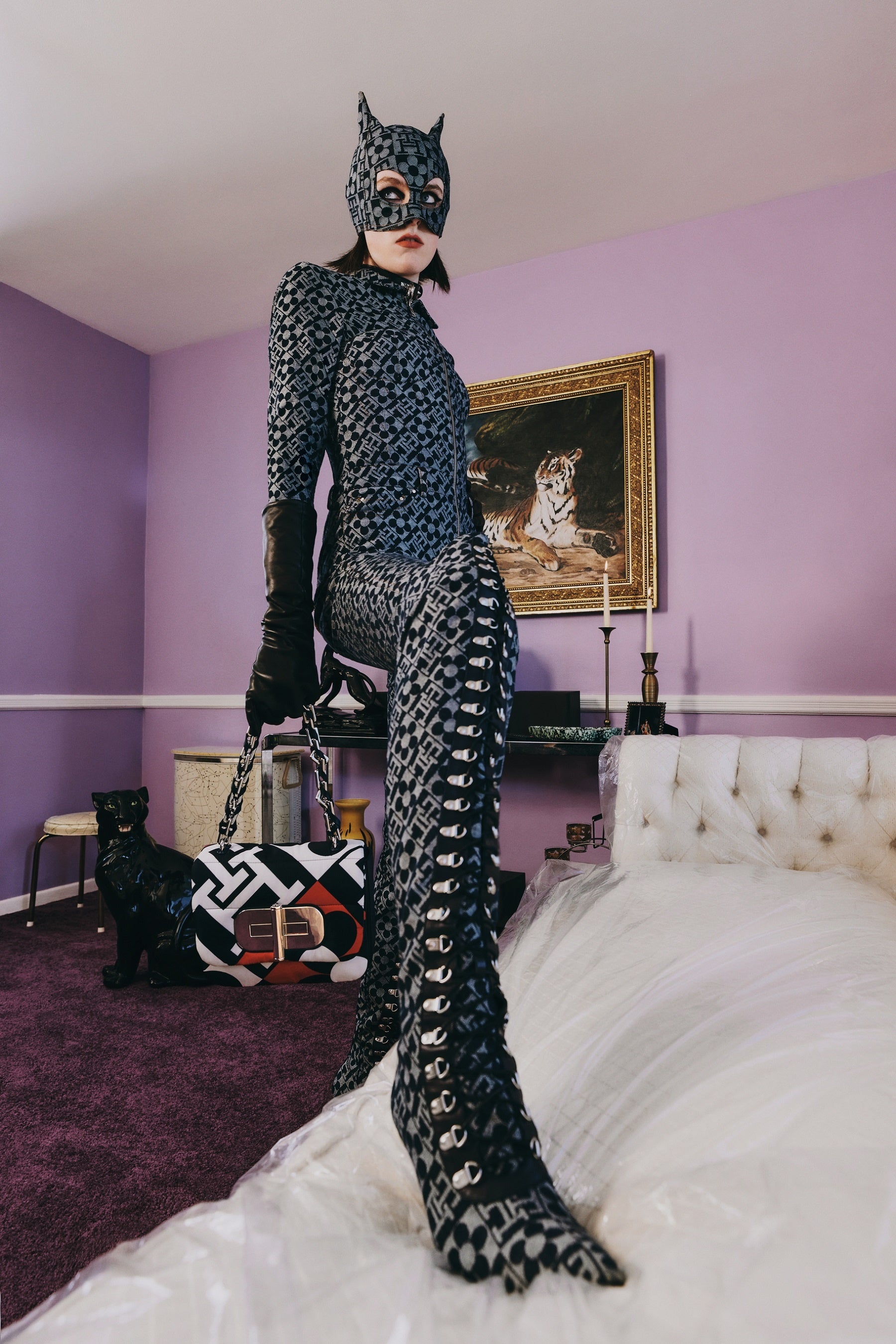 全体を通して、実験的なミスマッチや、繰り返されるモチーフの印象的な変化が、インパクトと好奇心を刺激します。テキスタイルは、プリントベロアや高密度ツイルなどラグジュアリーなもので、柄物のブーツやシルクスカーフなどのアクセサリーは個性的な主張をするアイテムとして登場します。
