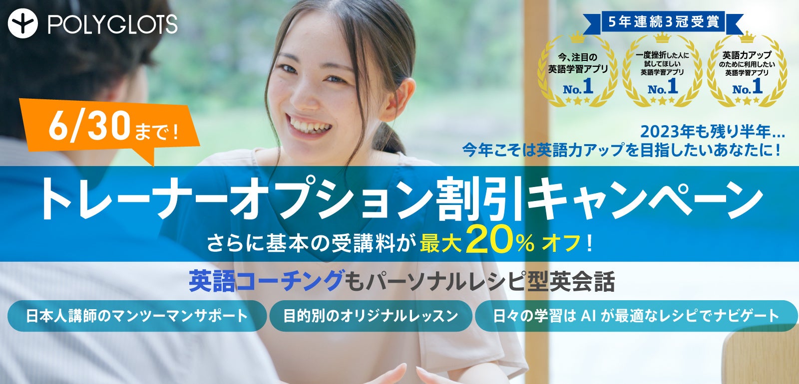 株式会社ポリグロッツ(本社:東京都新宿区、代表取締役:山口隼也)は、6月16日(金)~6月30日(金)までトレーナーオプション割引キャンペーンを開催いたします。開催期間中は、トレーナーオプションが最大35,000円OFF、さらにパーソナルレシピ型英会話プランも最大20%OFFでご提供します。このお得な機会に、トレーナーと一緒に英語学習を強化してください。
