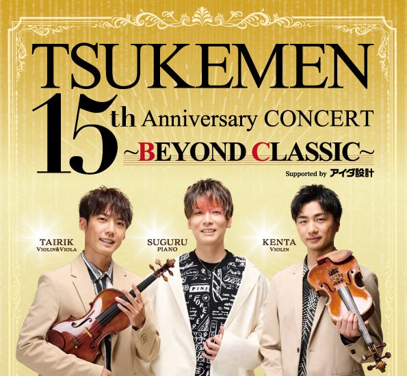 アイダ設計は今回、アコースティック・インストゥルメンタル・ユニットのTSUKEMEN(ツケメン)の15周年記念コンサートツアーに協賛いたします。メンバーはTAIRIK(タイリク)ヴァイオリン担当、SUGURU(スグル)ピアノ担当、KENTA(ケンタ)ヴァイオリン担当の3名で2008年に結成。数々のアルバムを発表し、TV、ラジオなどメディアでの活動も積極的に行い、今年15周年を迎える。心からの感謝をこめて 15周年イヤーを突き進むTSUKEMEN。この春、アニバーサリー・ツアーが全国各地で開幕いたします。