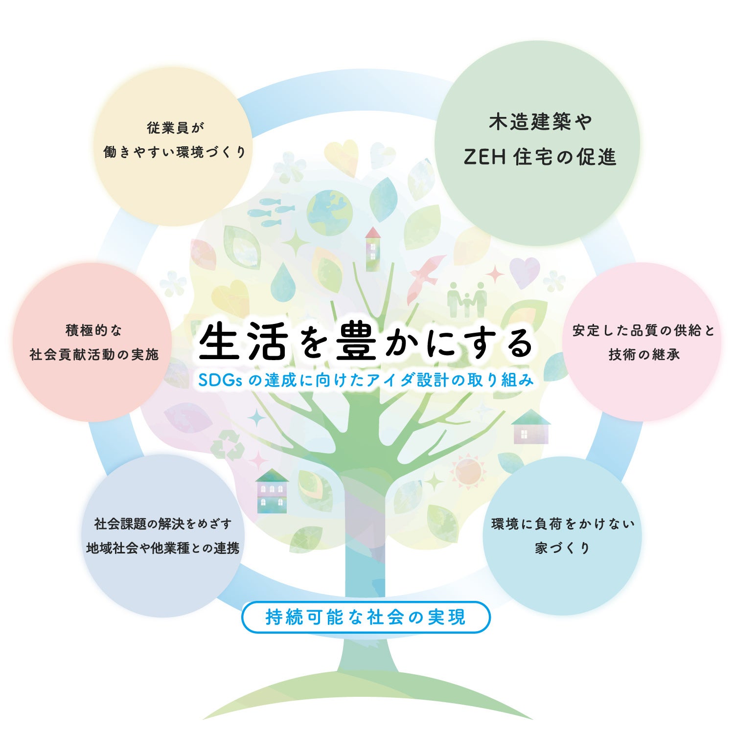 アイダ設計は持続可能な開発目標(SDGs)を支援しています。当社は住空間を提供する企業として、木造建築やZ E H 住宅の促進、安定した品質の供給と技術の継承、環境に負荷をかけない家づくりなどを通じて、地域社会とともに、持続可能な社会の実現に向けた活動を実践していきます。