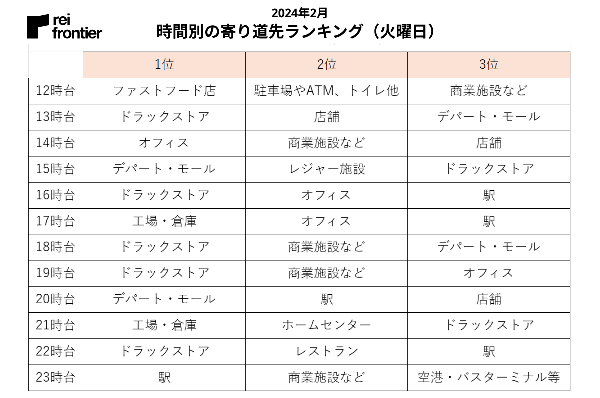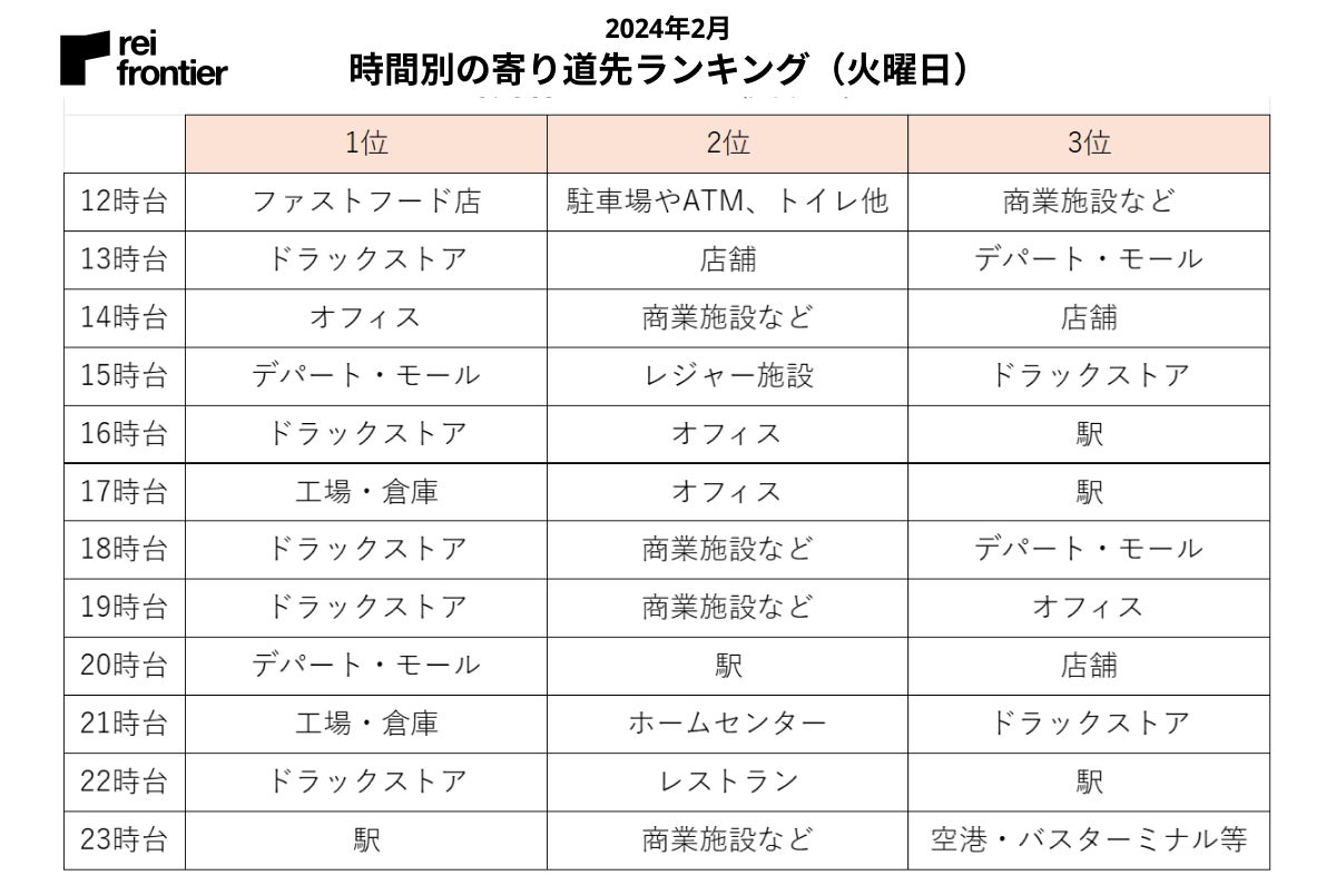 火曜日は「ドラッグストア」が1位にランクインしている時間帯が多いです。