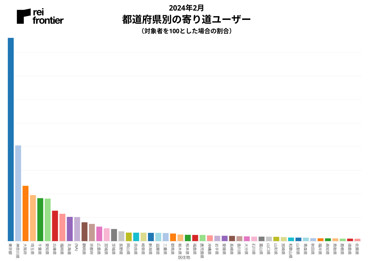 調査期間中に寄り道データのある10.0%の対象ユーザーデータを100とした時の比率で【都道府県別】【年代】【性別】をそれぞれグラフ化しました。