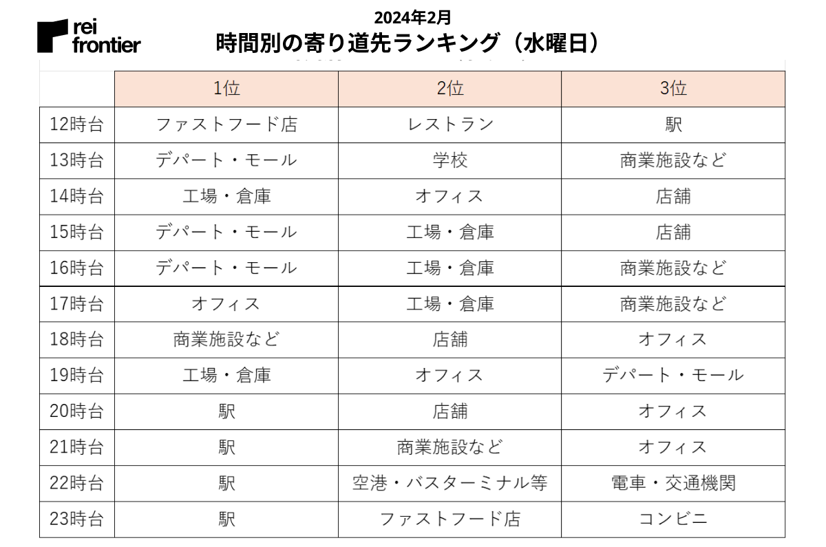 「ファストフード店」は火曜でも12時台で1位でしたが、水曜も同様にランチで寄り道している様子が見られます。