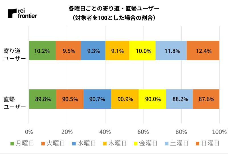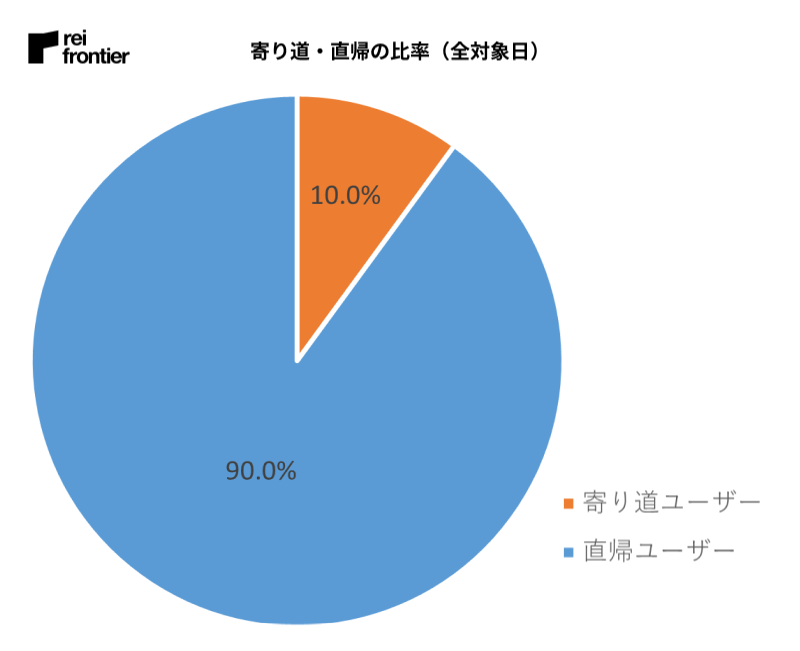 寄り道と直帰のユーザーを比較したところ、寄り道比率(全対象日)は10.0%でした。