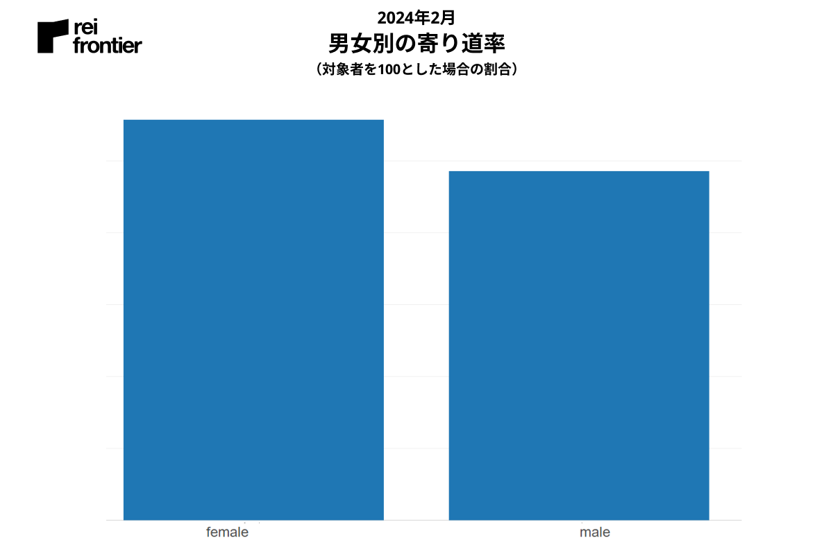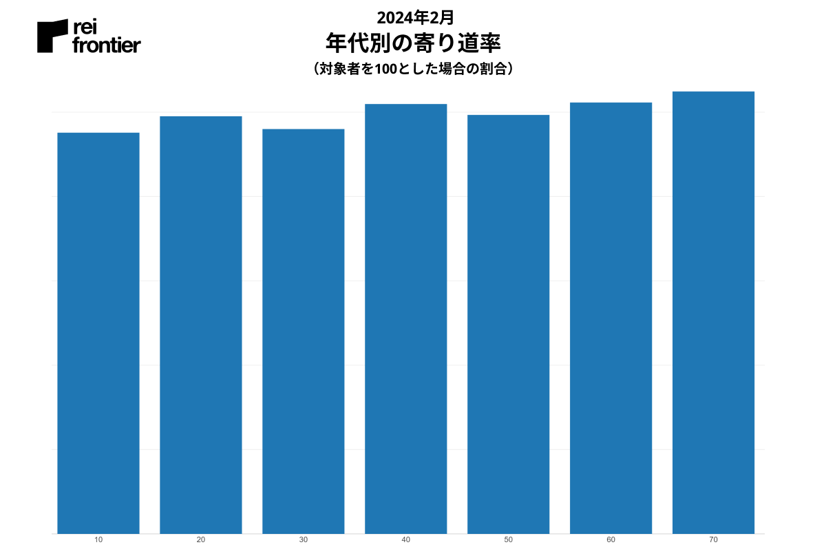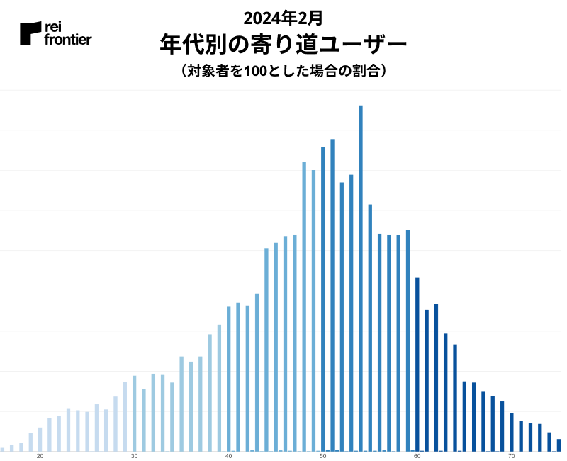 対象ユーザー全体では50代が多かったですが、寄り道ユーザーの結果から40代、60代の寄り道率が若干高いです。年代別でも女性の寄り道率が比較的高い結果となりました。