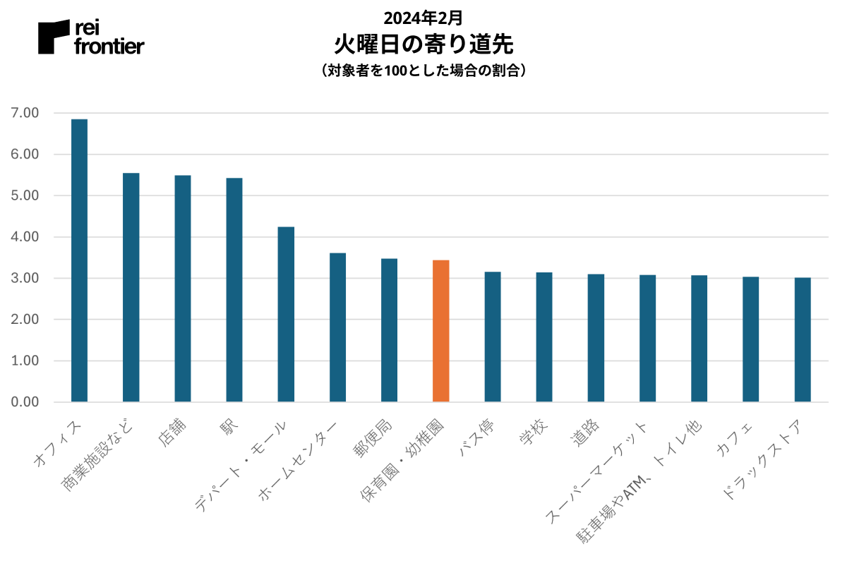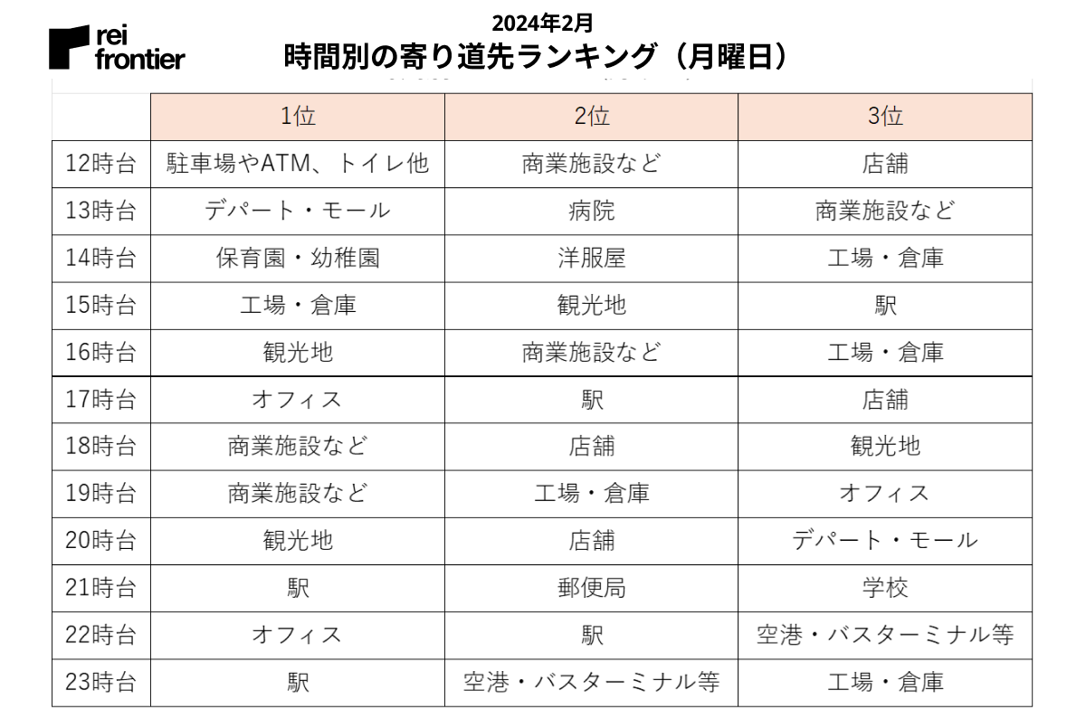 月曜日は夕方まで「保育園・幼稚園」「デパート・モール」「工場・倉庫」「観光地」などさまざまな場所が1位にランクインしています。2月は月曜に祝日があったことからこのような結果になったのかもしれません。