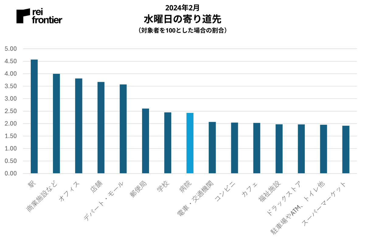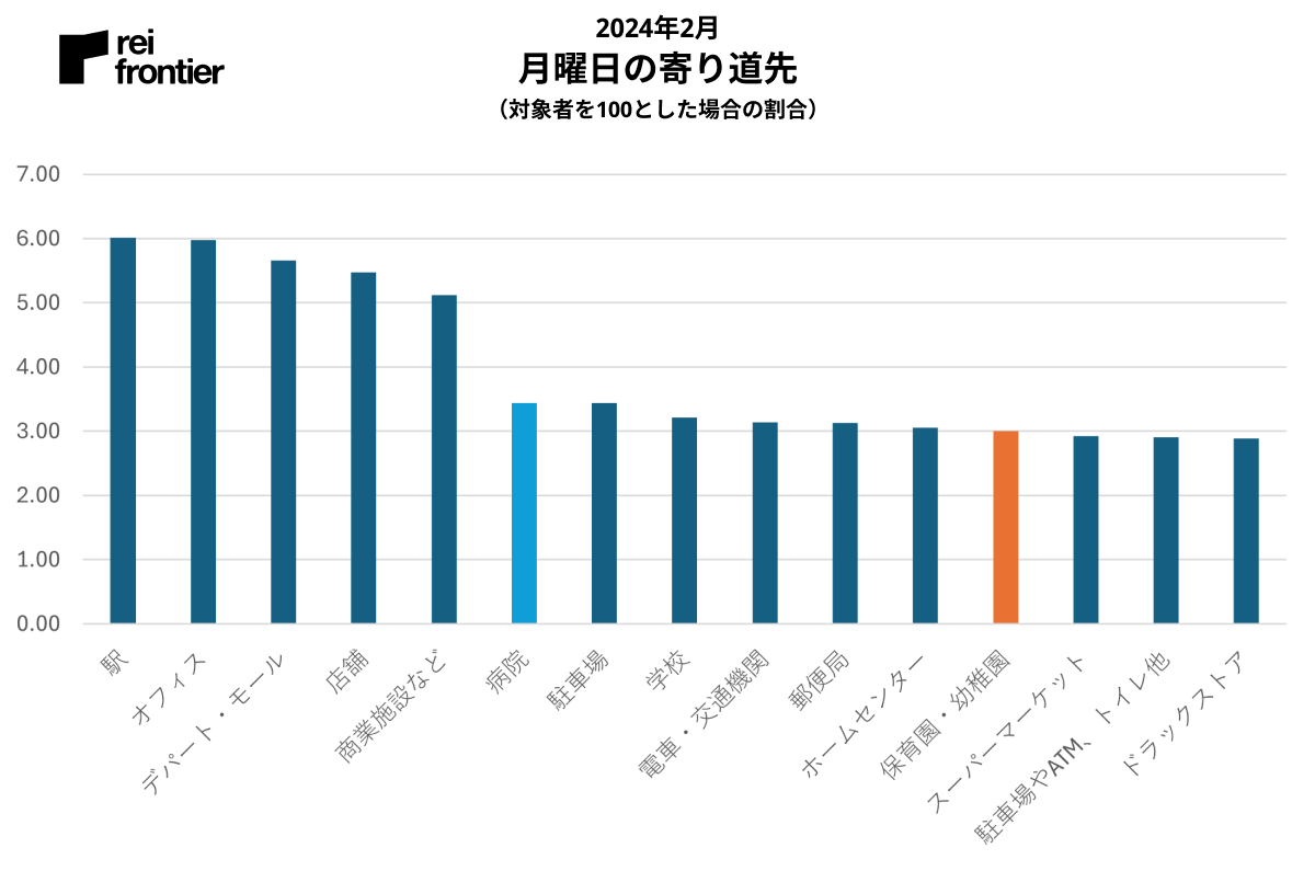 平日は保育園・幼稚園が多くランクインしていたり、休み明けの月曜や週の真ん中である水曜に病院への寄り道がみられたりなど曜日ごとの特徴が出ていたように感じます。