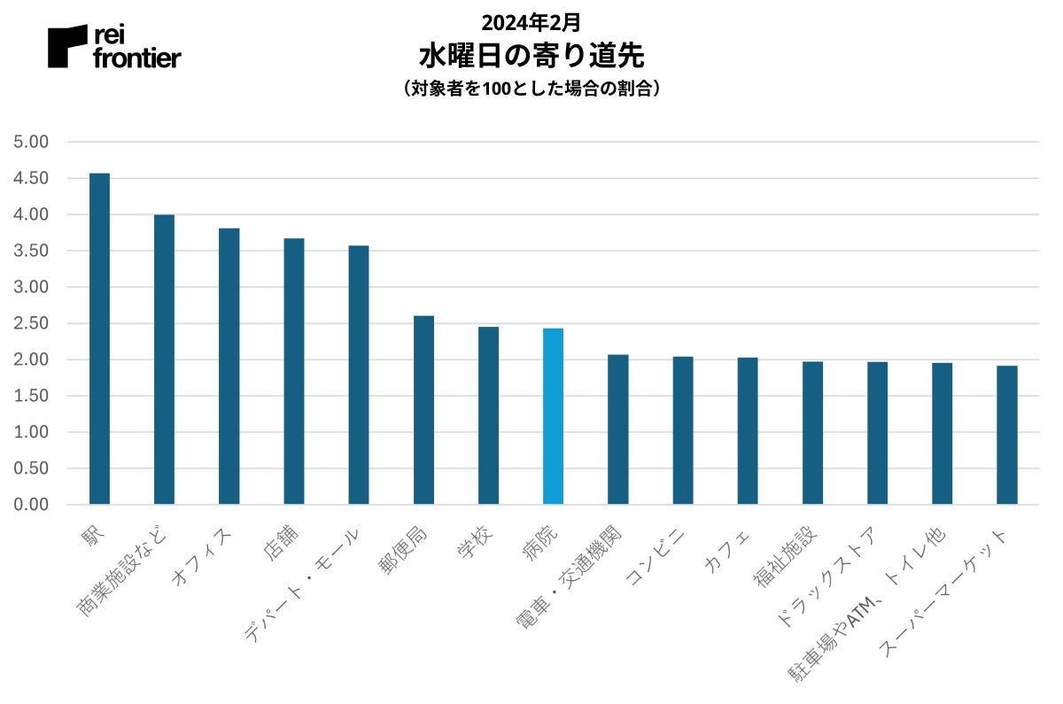 「病院」が月曜と水曜に上位へランクインしていることから、病院が土日お休みの関係で月曜に駆け込む方や、水曜のノー残業デーに合わせて通院している方もいるのかもしれません。