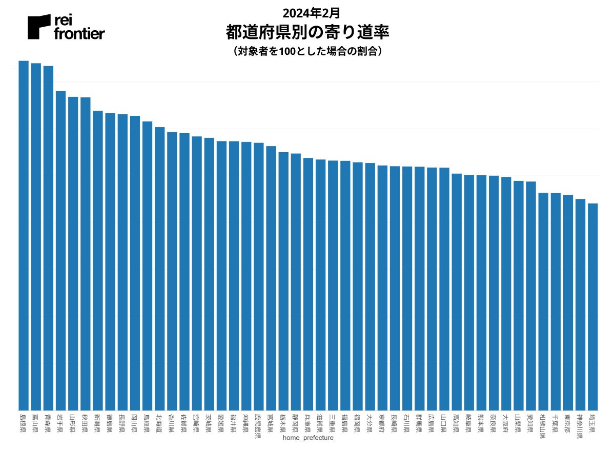 など、主に自動車が主要な移動手段と考えられる地域で寄り道率が高い結果となりました。調査対象期間が2月の冬ということで、たまたまかもしれませんが今回の結果では日本海側、東北地域が寄り道率が高くなる傾向でした。他の季節で調査して差異を見るのもおもしろそうですね。