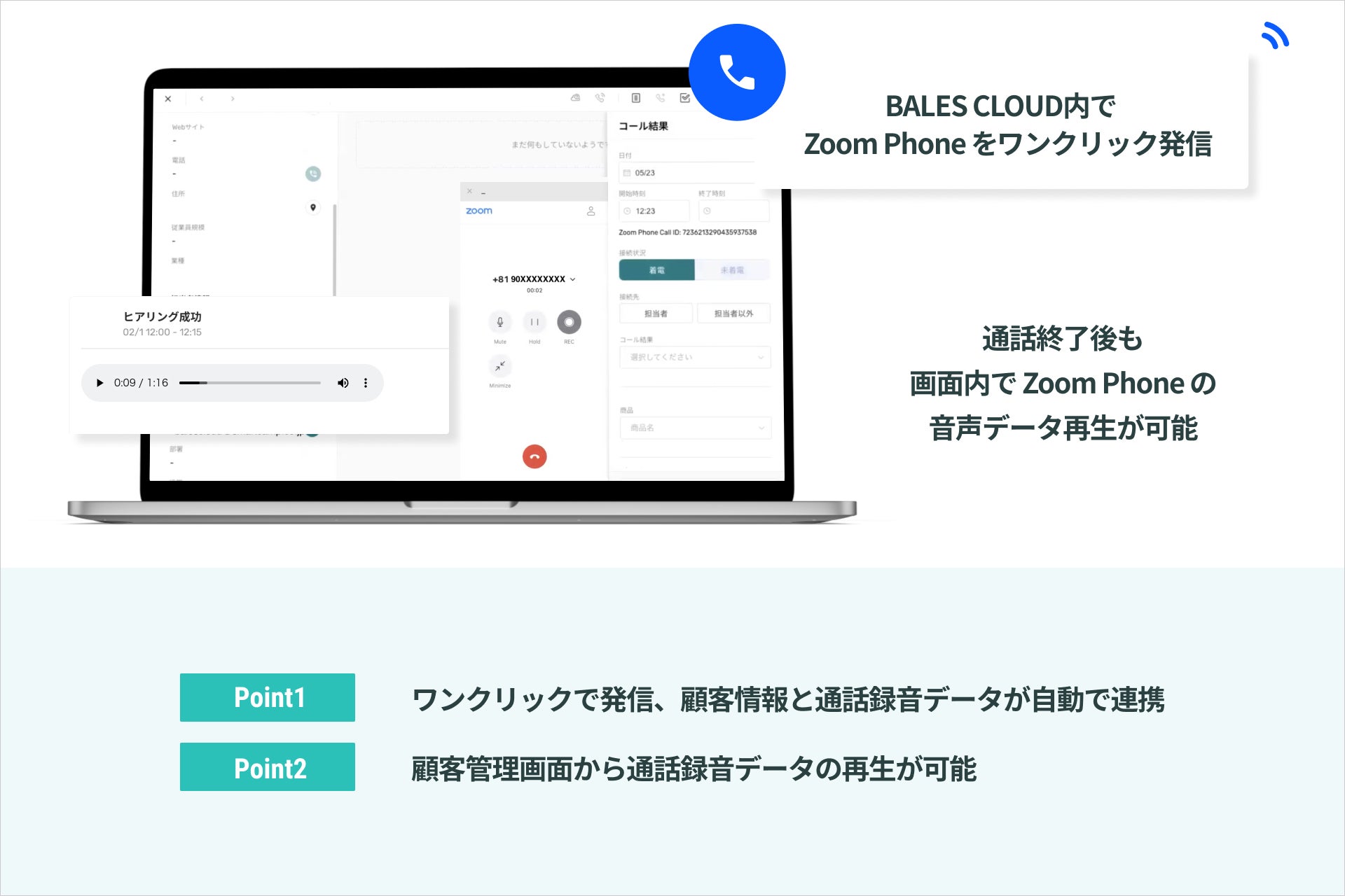 「Zoom Phone」は、ズーム・ビデオ・コミュニケーションズ社が提供するクラウド電話サービスで、固定電話をひも付けることによって、電話回線がなくてもインターネットがつながるところであればどこでも、外線、内線や転送機能などを利用できるサービスです。本連携によって、「BALES CLOUD」からワンクリックで「Zoom Phone」を利用でき、通話内容を録音することが可能となります(※)。また、通話終了後の録音データを再生する機能も追加されます。