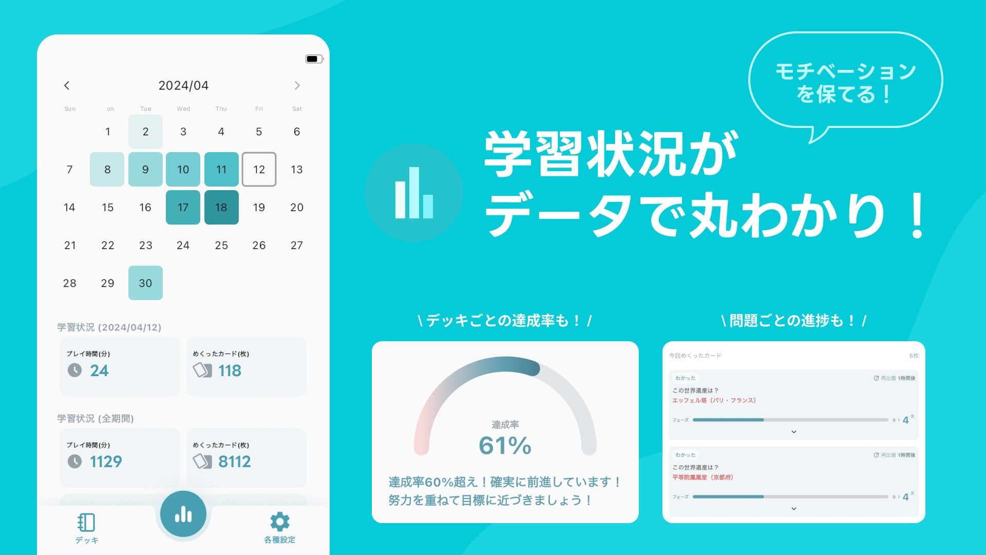 暗記の達成率がデッキごとにグラフで可視化されるほか、めくったカードの枚数や総プレイ時間など、細かな学習状況も記録されます。こまめに成果を振り返ることで、モチベーションを保ちながら学習することができます。