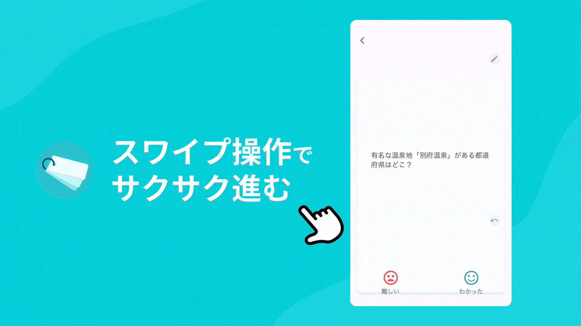 直感的なスワイプ操作に加え、ボタンやタップ操作にも対応。 お好みやシチュエーションに適したスタイルで、サクサク暗記を進められます。また、デッキは自習に使うだけでなく、他の人と共有することも可能です。友人と一緒に勉強するとき、お互い自作デッキを持ち寄れば問題を出し合うように楽しめます。