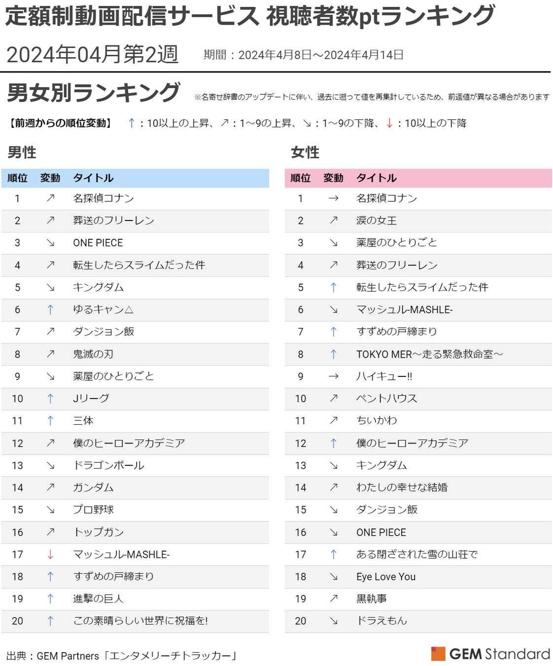 エンタテイメント業界に向けたデータ×デジタルマーケティングサービスを提供するGEM Partners株式会社(ジェムパートナーズ、所在地:東京都港区、代表取締役:梅津文)は4月16日、複数の定額制動画配信サービスを横断集計した2024年4月第2週(2024年4月8日~2024年4月14日)のコンテンツ別(※1)視聴者数ptランキング(全体・男性・女性)を発表します。