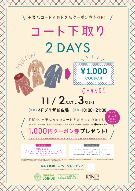 相鉄グループの㈱相鉄ビルマネジメント(本社・横浜市西区、社長・左藤 誠)が運営するジョイナスは、サステナブルな施設を目指しさまざまな活動を行っています。その一環として、2024年11月2日(土)・3日(日)の2日間、不要なコートをお持ちいただくと、ジョイナスでご利用いただける1,000円クーポン券と交換できる、「コート下取り2DAYS」を開催いたします。