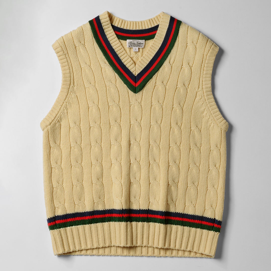 1980年代後半に展開していたボーイズのテニスベストを復刻。衿と袖に配されたリブはミドルゲージで切り替えて、すっきりと収まりよく仕上げています。チクチク感の少ない滑らかな肌触りの上質なウールを使用。程よいゆとりのあるボディ、ボトムを選ばない丈感など細部にこだわった1着です。