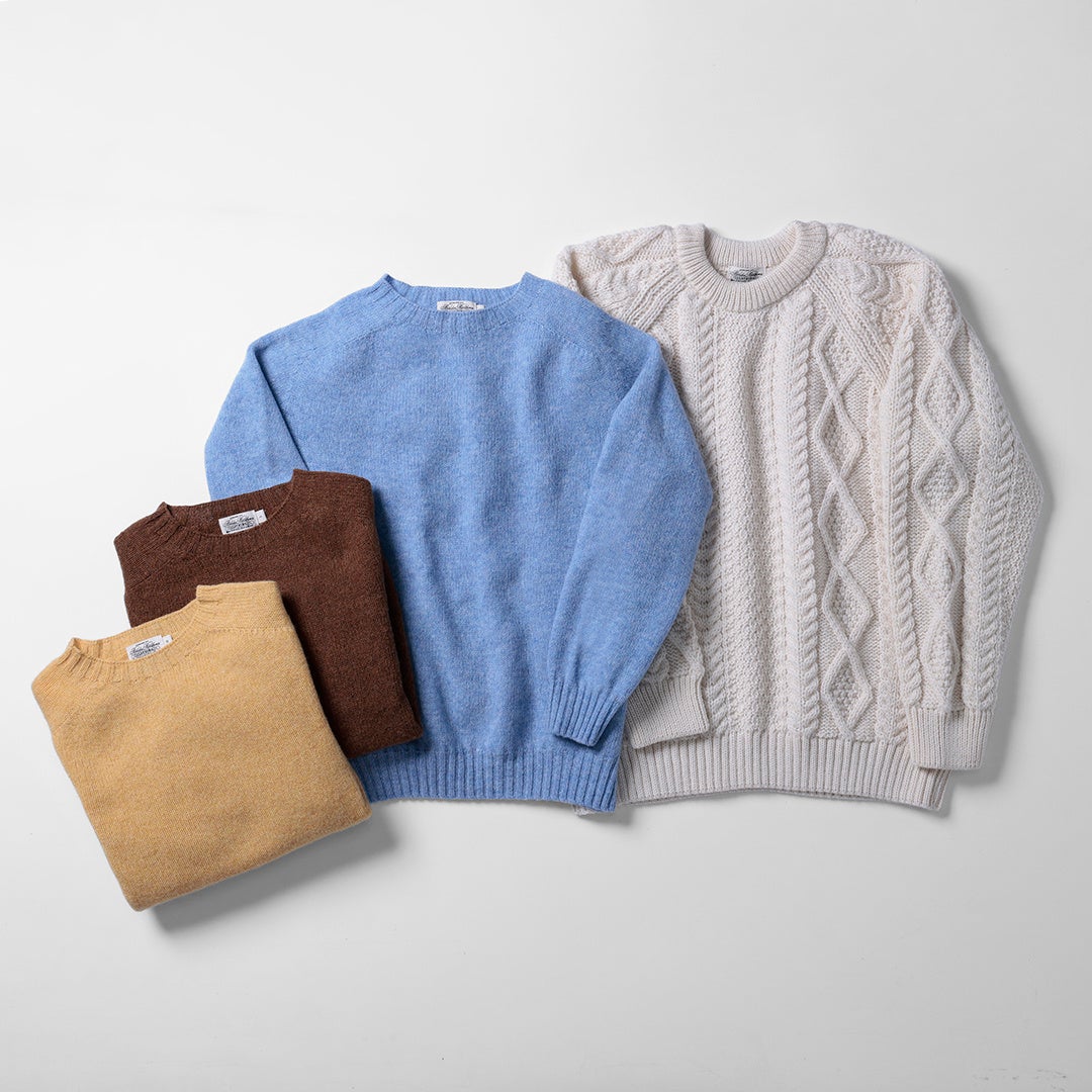 左:シェットランドセーター(5色展開)税込価格 各¥39,600 右:ケーブルセーター 税込価格¥53,900