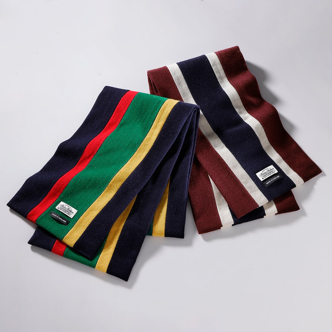 (左)いつの時代も変わらない人気を誇るアーガイルサザーランドカラーからインスピレーションを得て作られたアクセントカラーが目を引くストライプと、(右)1970年代後半のカタログに描かれていたスクールマフラーをそのまま抜き出したようなストライプの2色展開。
