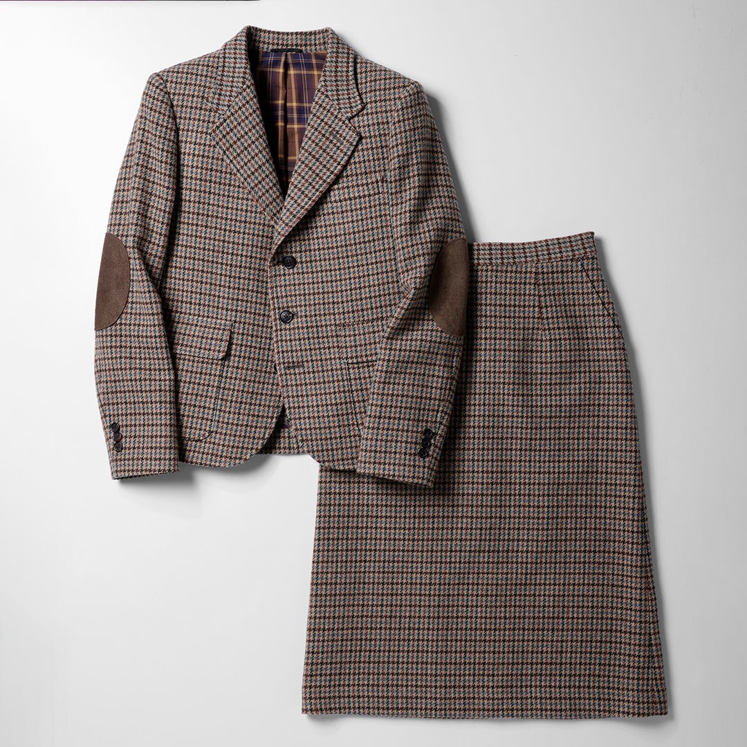 1980年代に展開されていたボーイズジャケットのシルエットからインスパイアされたこともあり、メンズライクなスタイリングにもぴったりです。スエードのエルボーパッチとコットンフランネル素材を使用したチェック柄ライニングがアクセントになっています。同生地のスカートと合わせ、セットアップでも楽しめます。