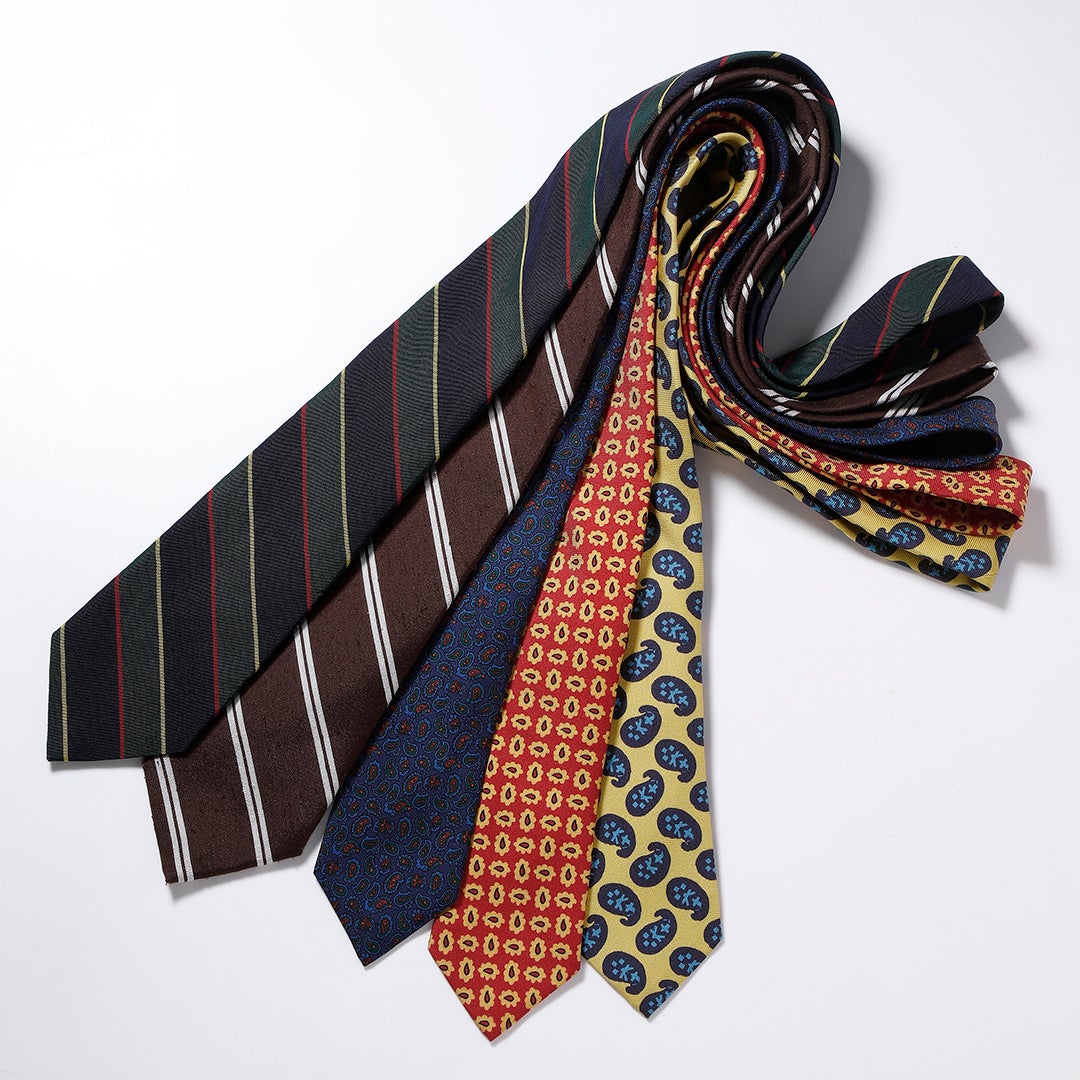左:アーガイルサザーランドストライプのレップタイ。生地は英国Stephen Walters社で当時のレシピを忠実に再現。茶ストライプ:古き良きシルクシャンタン生地をイタリアのCANEPA社で表現。右から3つ:草木染の権威、ROBERT KEYTE社のシルクマダープリントを使用。大剣幅7cm。