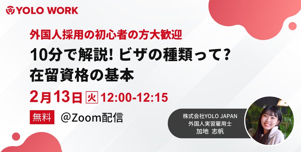 226の国と地域出身26万人以上の在留外国人が登録している日本最大級のメディアを運営する、株式会社YOLO JAPAN(代表取締役:加地太祐、大阪本社:大阪市浪速区、以下「YOLO JAPAN」)は、「10分で解説!ビザの種類って?在留資格の基本」(オンラインセミナー)を、2024年2月13日(火)に開催します。