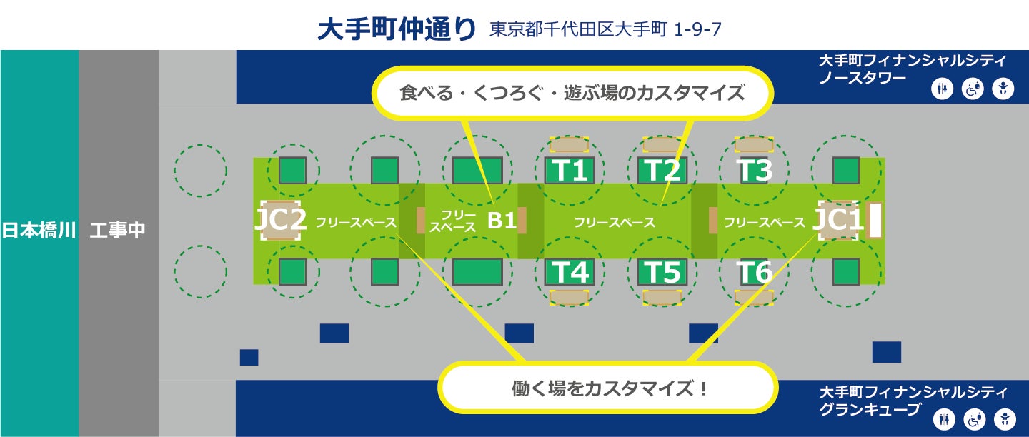 一般社団法人大手町歩専道マネジメント(以下、大手町歩専道マネジメント)と三菱地所株式会社(以下、三菱地所)は、東京・大手町の歩行者専用道路「大手町川端緑道」の未来の空間活用を見据え、神田と大手町を繋ぐ場所として“外空間”の居方を検証するための社会実験「BATON PARK-KAWABATA-RYOKUDO-」(以下、BATON PARK)を2022年10月24日~30日の7日間、大手町仲通り※にて実施いたします。