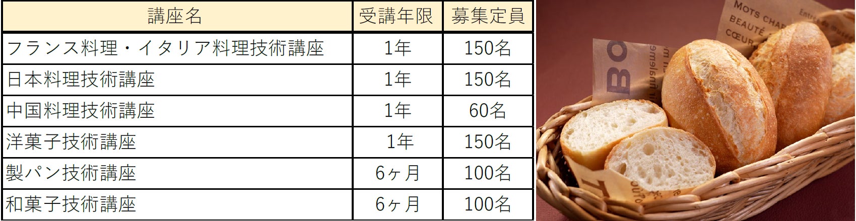 10月に開講するのは、1年コースの【フランス料理・イタリア料理技術講座】【日本料理技術講座】【中国料理技術講座】【洋菓子技術講座】と、6ヶ月コースの【和菓子技術講座】、そしてリニューアルされ2年ぶりに開講する【製パン技術講座】の計6講座となります。