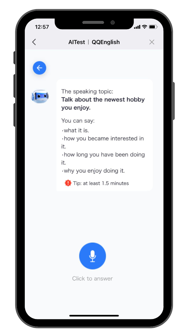 AI Testは、QQEnglishのアプリまたはマイページ上で利用することができる、英語力診断テスト機能です。出題されたトピックについて英語で回答することで、AIによる英語力診断レポートを受け取ることができます。