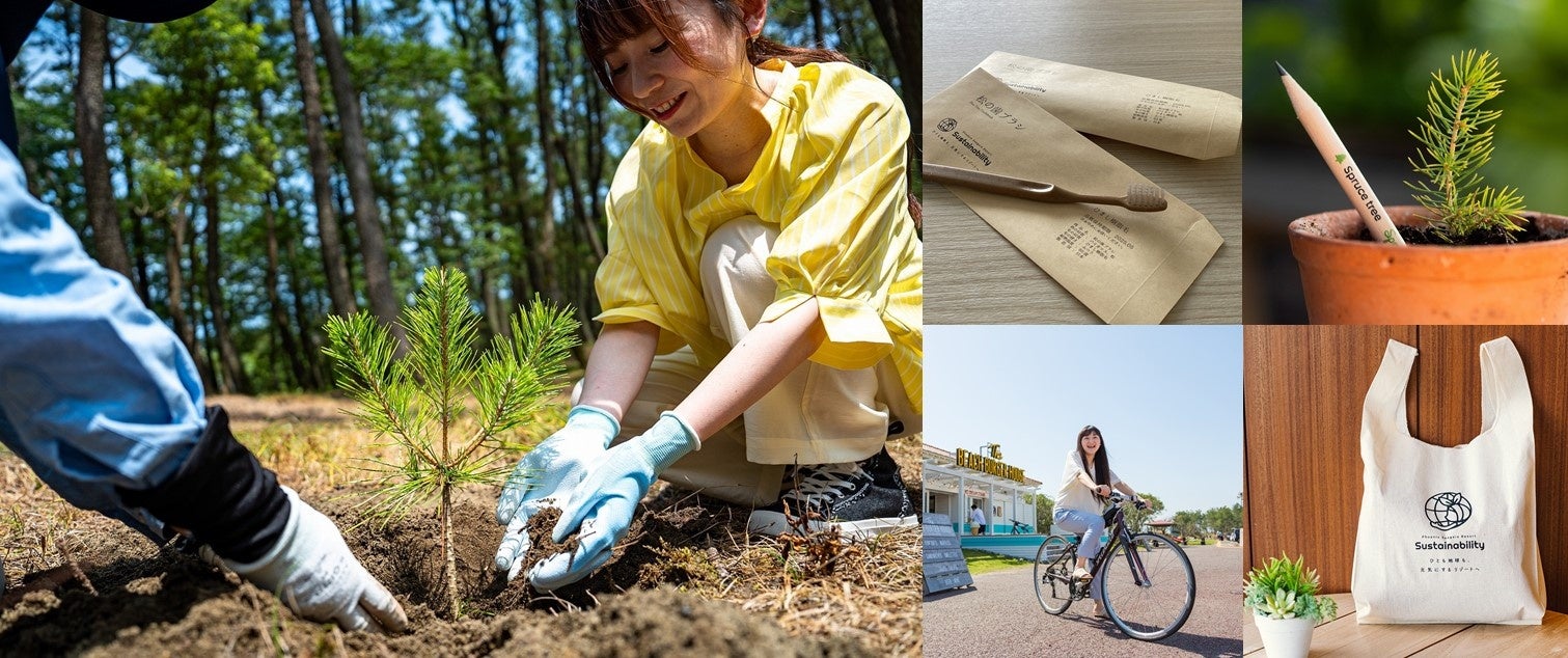 この宿泊プランは、シーガイアのリゾートエリアに広がる黒松林の保護・育成を目的とした「黒松林の植樹プログラム」(1部屋あたり1苗)、ホテル内のレストランで提供しているパイナップルから、本来廃棄される“へた”の部分を利用し、3年後の収穫を目指して育成を行う「パイナップル再生プログラム」(9月・10月限定)のいずれかの体験プログラムを受けられるほか、客室にはリゾート内の廃棄松を使用した樹脂製の「松の歯ブラシ」をはじめ、「植えると芽が出る鉛筆」やシーガイアのサステナビリティロゴマークをあしらった「エコバッグ」などエコを意識しながらも、使って楽しいアイテムをご用意。また環境に配慮した移動手段として、レンタサイクルを1日乗り放題(いずれか1日)で利用いただけます。