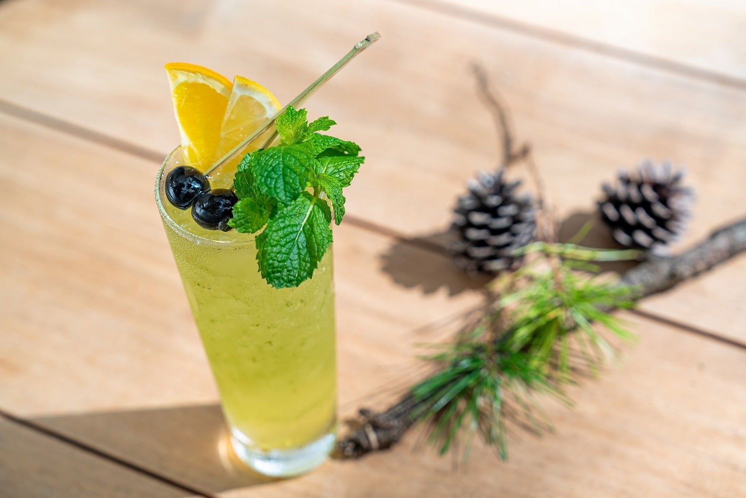 カクテルバー「パシフィカ」では、シーガイアを取り囲む黒松林をイメージし、松葉茶を使ったノンアルコールカクテルの提供を始めます。緑茶カラーのドリンクの中に散りばめた日向夏ゼリーは、松の葉から差す木漏れ日のキラキラ感を表現しました。日向夏の甘酸っぱさと、緑茶のさわやかな後味で、まるで黒松林の中にいるかのような清涼感が体感できるカクテルです。