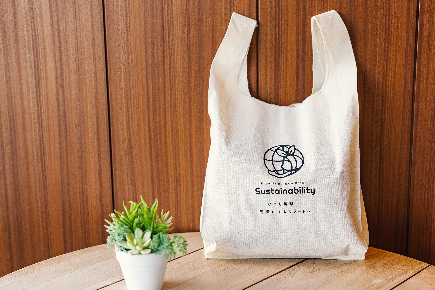 シーガイアのサステナビリティロゴ入りエコバッグ。リゾートステイから普段使いまで様々なシーンで活用いただけます。