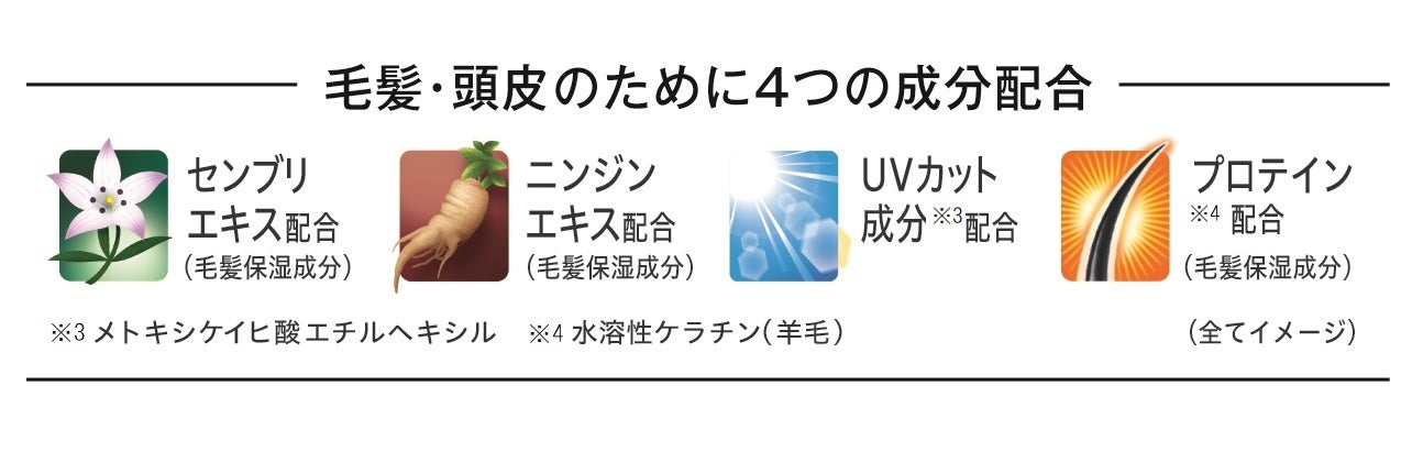 センブリエキス(毛髪保湿成分)、ニンジンエキス(毛髪保湿成分)、UVカット成分※3、プロテイン※4(毛髪保湿成分)を配合。※3メトキシケイヒ酸エチルヘキシル ※4水溶性ケラチン(羊毛)