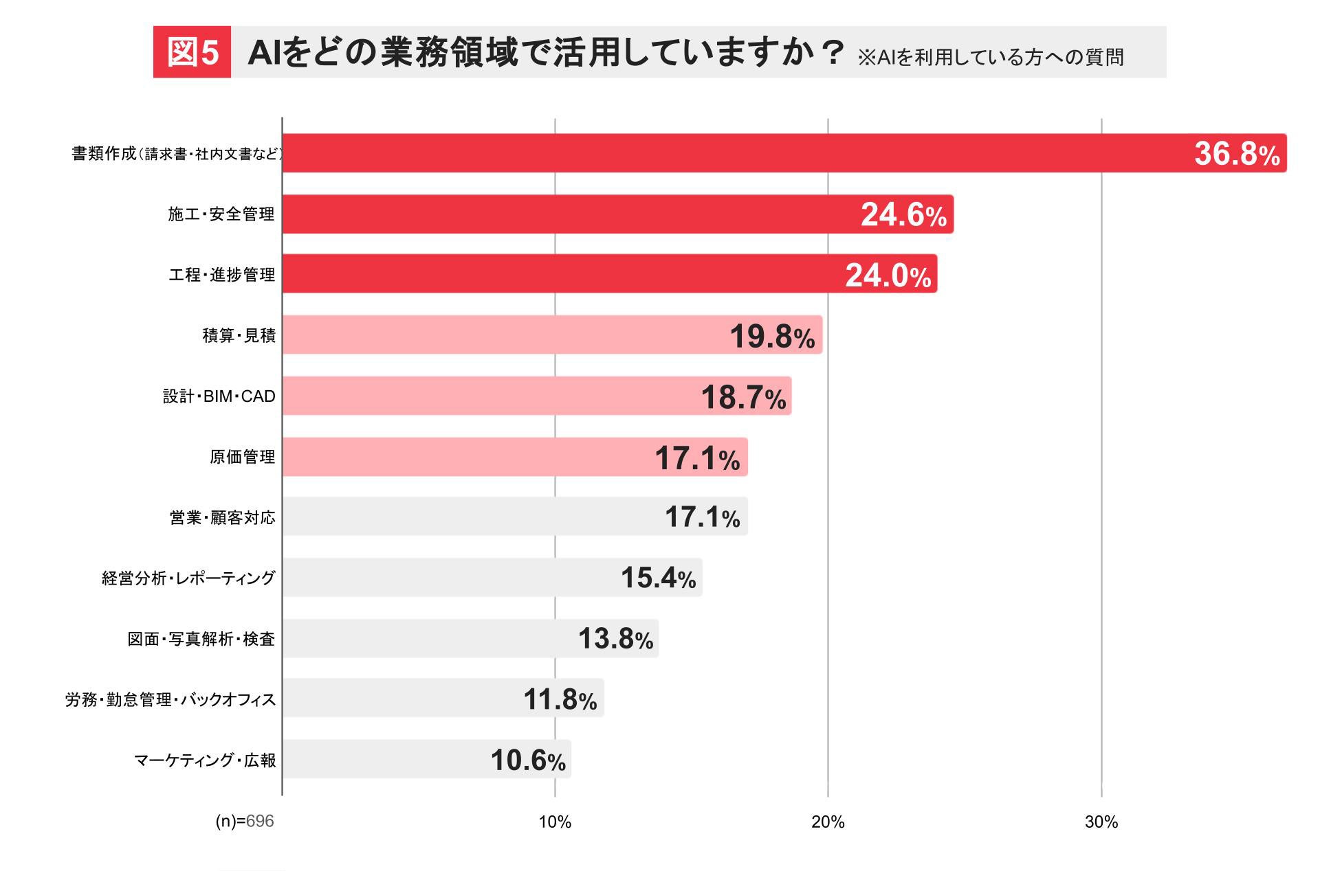 「書類作成」というイメージのしやすいAI活用が36.8%と一番多く、「施工・安全管理」24.6%や「工程・進捗管理」24%といった建設特有の領域での活用が進んでいます。また、積算や設計、原価管理の領域でも約2割となっており、現場からバックオフィスまで様々な領域でAI活用が始まっています。(図5)