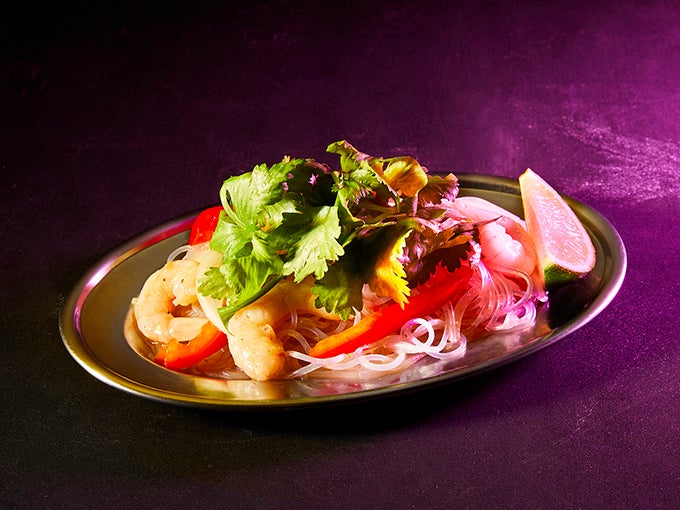 春雨に海老とパプリカ・玉ねぎを和えて、パクチーをトッピングしたタイ風サラダ。