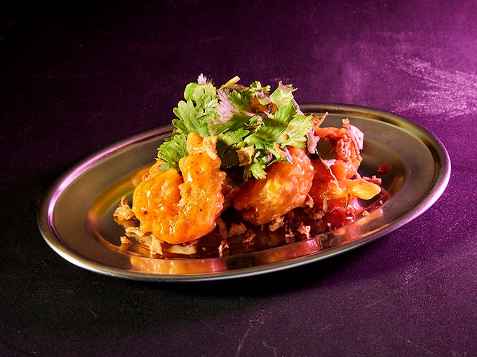 ハリッサマヨで和えた、クミン・コリアンダー香る甘辛海老マヨです。