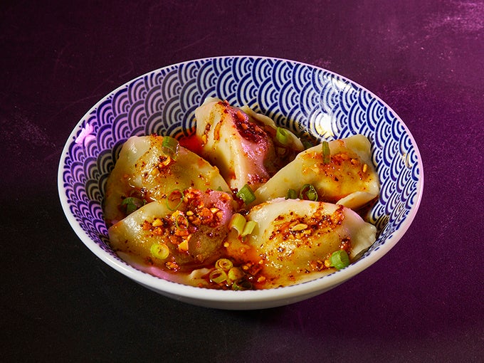 もちもちのニラ入り水餃子に、ザクザク麻辣油とコクのある胡麻ソースをかけました。