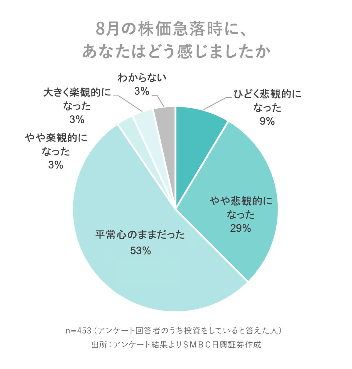 ・同様に「8月の株価急落時に、あなたはどう感じましたか」と聞いたところ、約半数の方は「平常心のままだった」と回答
