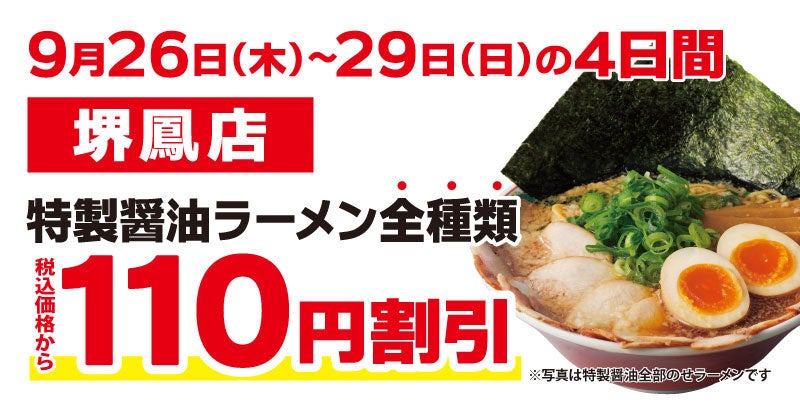 この度オープンを記念して、「堺鳳店」にご来店いただいたお客様には、『特製醤油ラーメン全種類』を税込価格から110円割引で販売いたします。