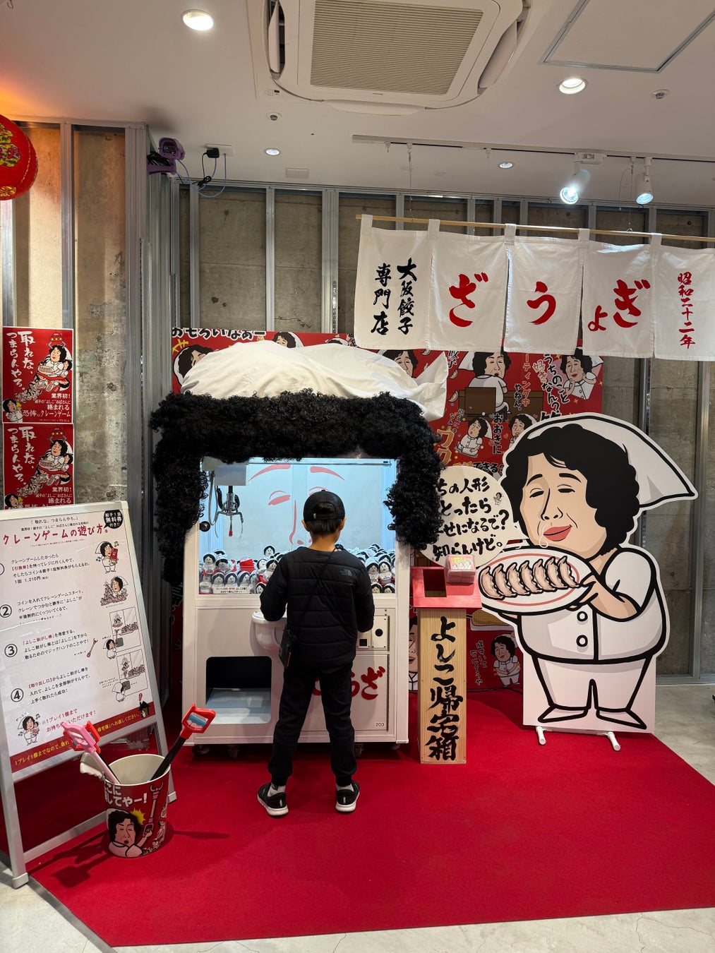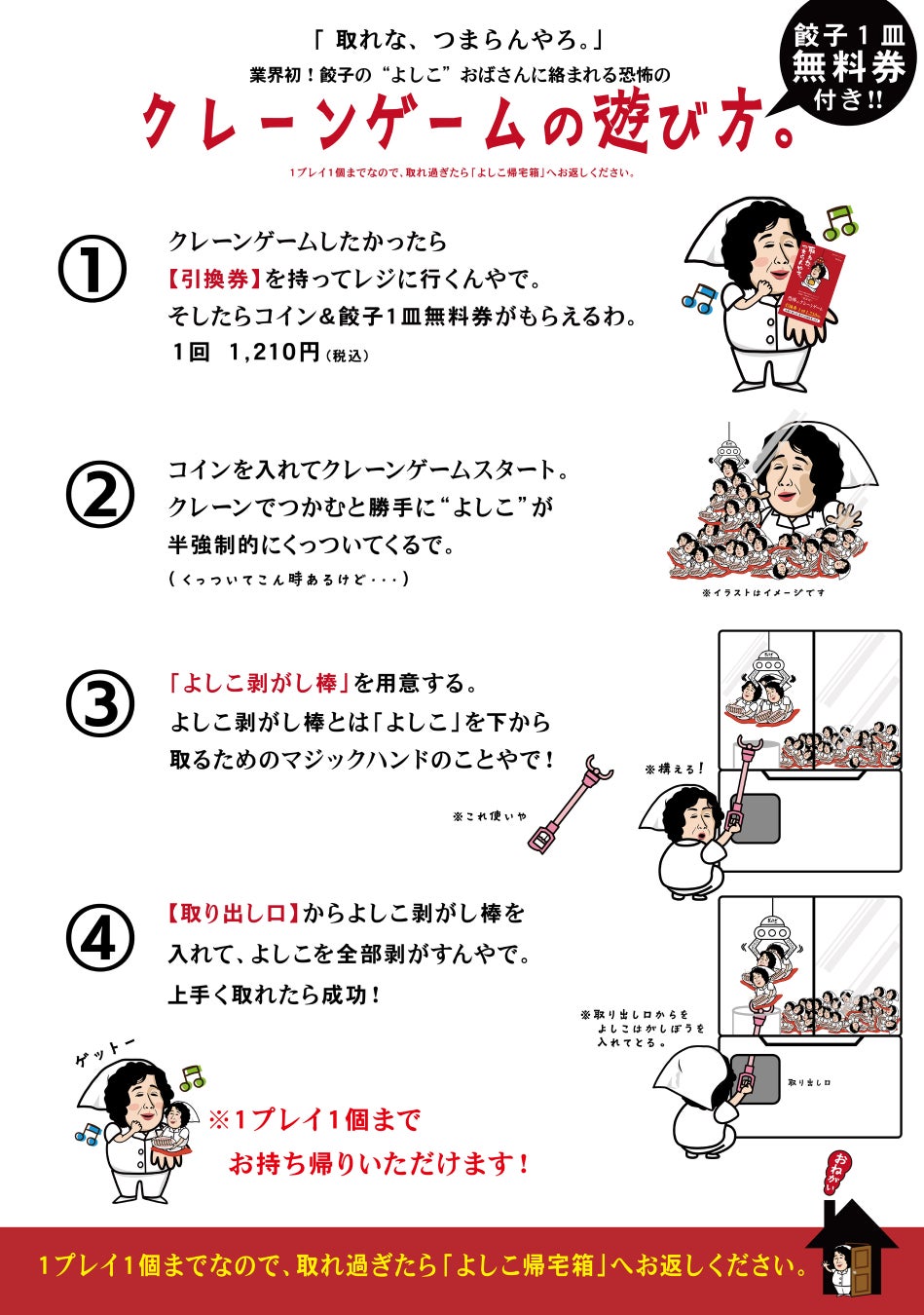 一度絡んだら離れようとしない“よしこ”には専用の「よしこ剥がし棒」でアームから強制離脱を。オープン初日は餃子好きのお客様が大勢お越し頂き、「ウケるw」「ぬいぐるみがアームに付いてきた!」「アームゆるいw」など様々なお声を頂きました。大阪魂全開の一風変わった餃子体験に是非お越しください。