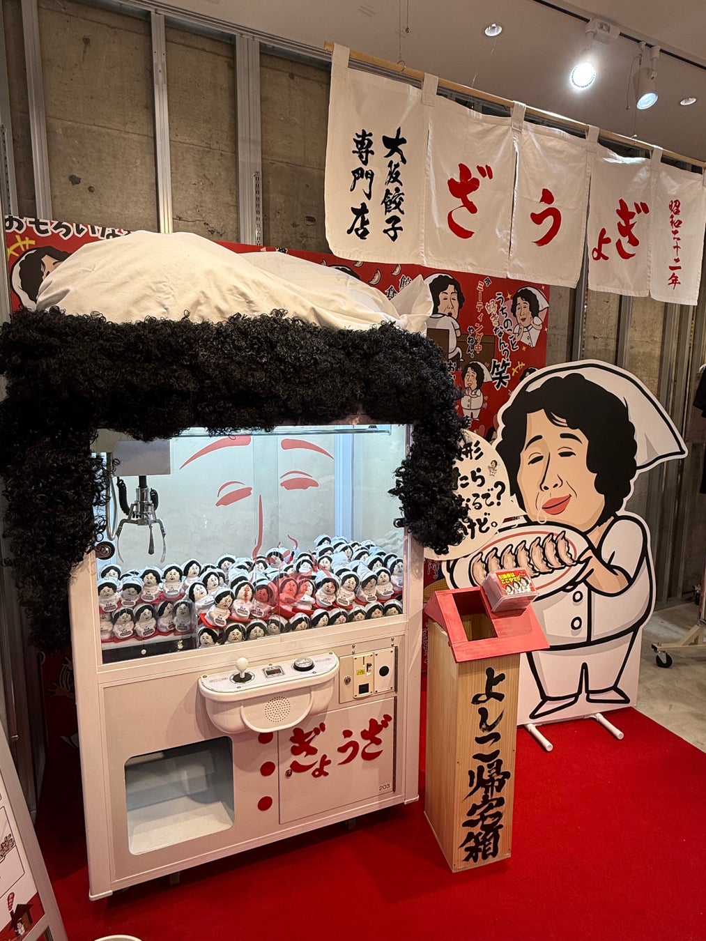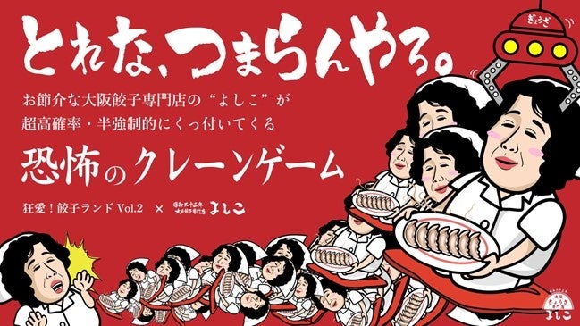 そんな全国から多くの若者が集まる原宿の注目イベントに、大阪のおかん(よしこ)の餃子の味を再現した「大阪餃子専門店よしこ」が登場。しかもメインは餃子ではなく、この日のために大量生産した“よしこ”ぬいぐるみが入ったクレーンゲーム。設定ゆるゆるのやる気の無いアームに、お節介おばちゃん“よしこ”ぬいぐるみが「取れな、つまらんやろ!」とまさかの強制密着してくる、恐らく業界初のお節介クレーンゲームとなっております。