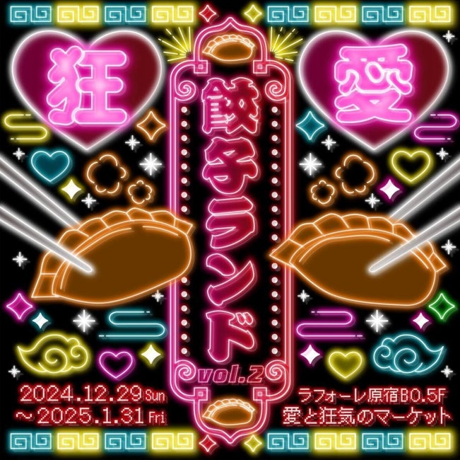 ラフォーレ原宿の地下0.5階で展開する、あらゆる才能と出会いを楽しむマーケット「愛と狂気のマーケット」では2024年12月29日から2025年1月31日まで、全国の「餃子好き」必見のイベント「狂愛!餃子ランド」第二弾を開催。全国から集まった餃子モチーフの小物から本物の冷凍餃子まで、餃子の可愛いフォルムに癒される作品・商品たちを集積した特別企画です。