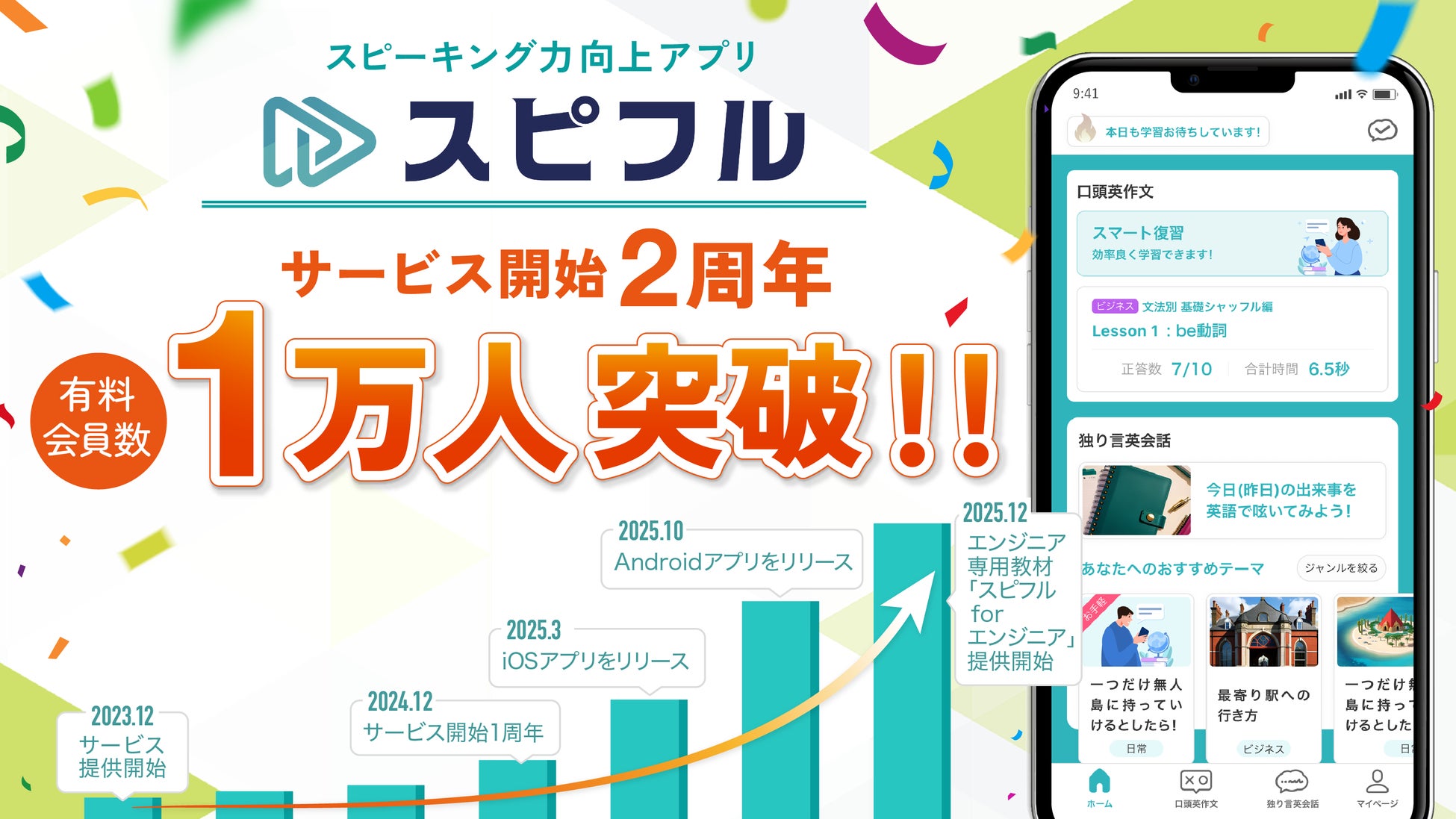 英語学習プラットフォームの株式会社プログリット(本社:東京都港区浜松町、代表取締役社長:岡田 祥吾、証券コード:9560)が提供する、スピーキング力向上に特化したサブスクリプション型英語学習サービス『スピフル』は、2025年12月19日にサービス開始から2周年を迎え、有料会員数が1万人を突破したことをお知らせいたします。(※1)有料会員数は直近1年で約4倍に成長しており(※2)、AIによる個別最適化された学習体験と、業界・職種に特化したコンテンツ拡充など継続的なサービスアップデートが支持されています。