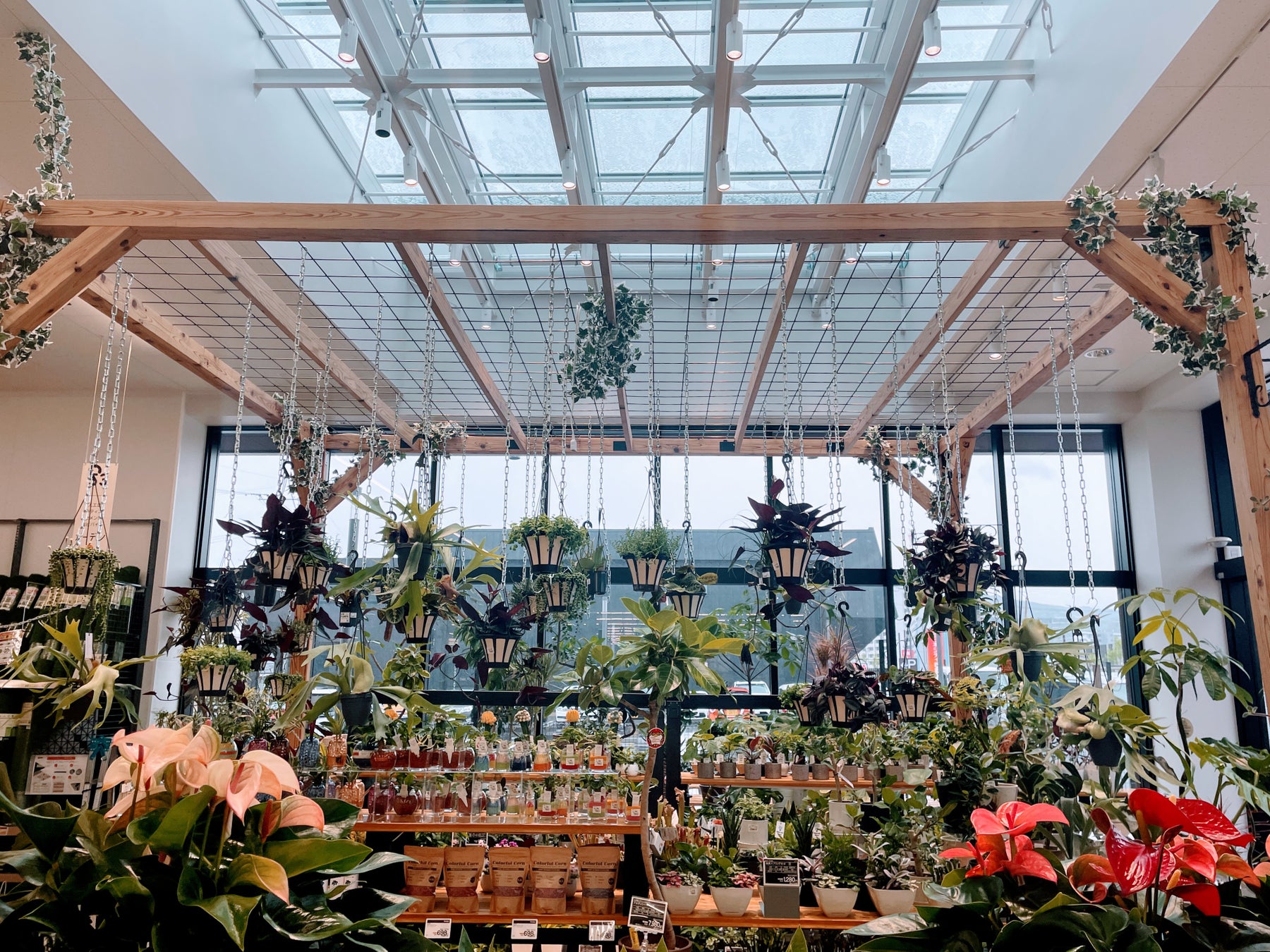 伊都店舗入口につながる通路周辺は屋外園芸売場。季節ごとに色とりどりの花苗が出迎えてくれます。また、建物内には天井採光があるスペースの下に観葉植物売場が広がります。