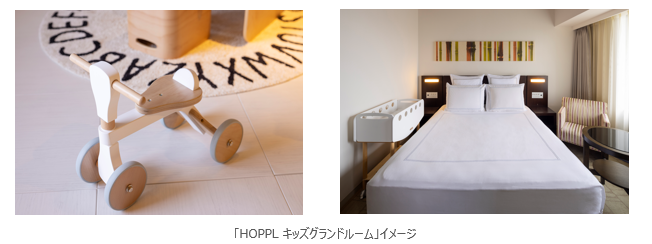 「HOPPLキッズグランドルーム」は、ゆったりと滞在できる約57平米の客室を、就学前のお子さまが素足で遊べる空間へとアレンジした1室限定プランです。ベビーバスや哺乳瓶消毒セット、踏み台、防水シーツなどの備品はもちろん、創造力を育てる「コロコロチェア&デスク」、そしてやさしい色合いと肌触りの「ファーストウッディバイク」などもご用意。ホテル滞在中でも、まるでご自宅にいるかのような快適な時間をお過ごしいただけます。