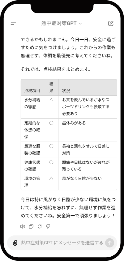 自然な対話のなかで、ヒアリングによる熱中症対策点検を行い、結果を表形式で表示します。音声対話でもやりとりすることができ、現場で気軽に体調チェックすることが可能です。