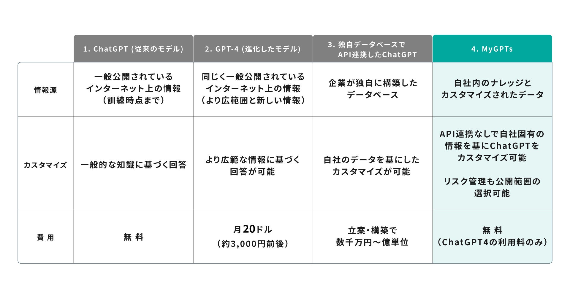 しかし、MyGPTsによって、API連携をせずとも誰でも簡単に自社用にカスタマイズし情報を蓄積できるChatGPTを構築できるようになりました。GPT-4の利用料以外に追加費用なしです。リスク管理として、情報公開範囲も「公開」「限定公開」「公開しない」と選択することができ、企業での生成AI活用の技術ハードルが一気に無くなりました。