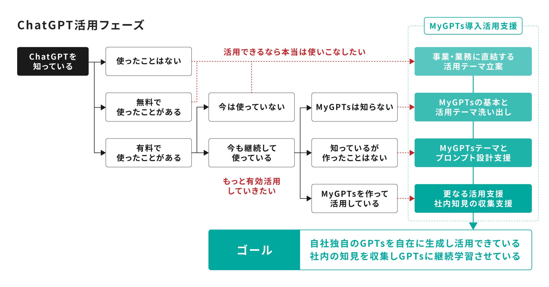 ChatGPTの認知度は、この1年で大きく高まりました。しかし、知っているが使ったことはない、少し触ったが継続して活用していない、という方が大半です。今回のMyGPTs導入支援では、そのような方も、そしてChatGPTを継続して利用している方には更なる活用支援をサポートいたします。