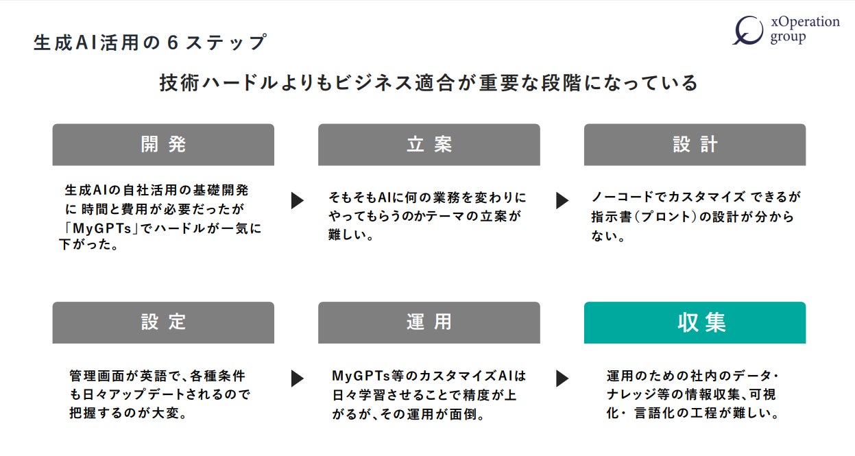 初期は、コンサルティングという形式で導入支援を行っていきますが、現在、AIが各社に沿った適切なテーマと詳細なプロンプトを提示できる業務特化型ChatGPTの開発にも着手します。そうなれば、利用企業が、当社XOPのコンサルティングを受けずとも、自分たちで適切なMyGPTsを構築し、ビジネス活用することができます。